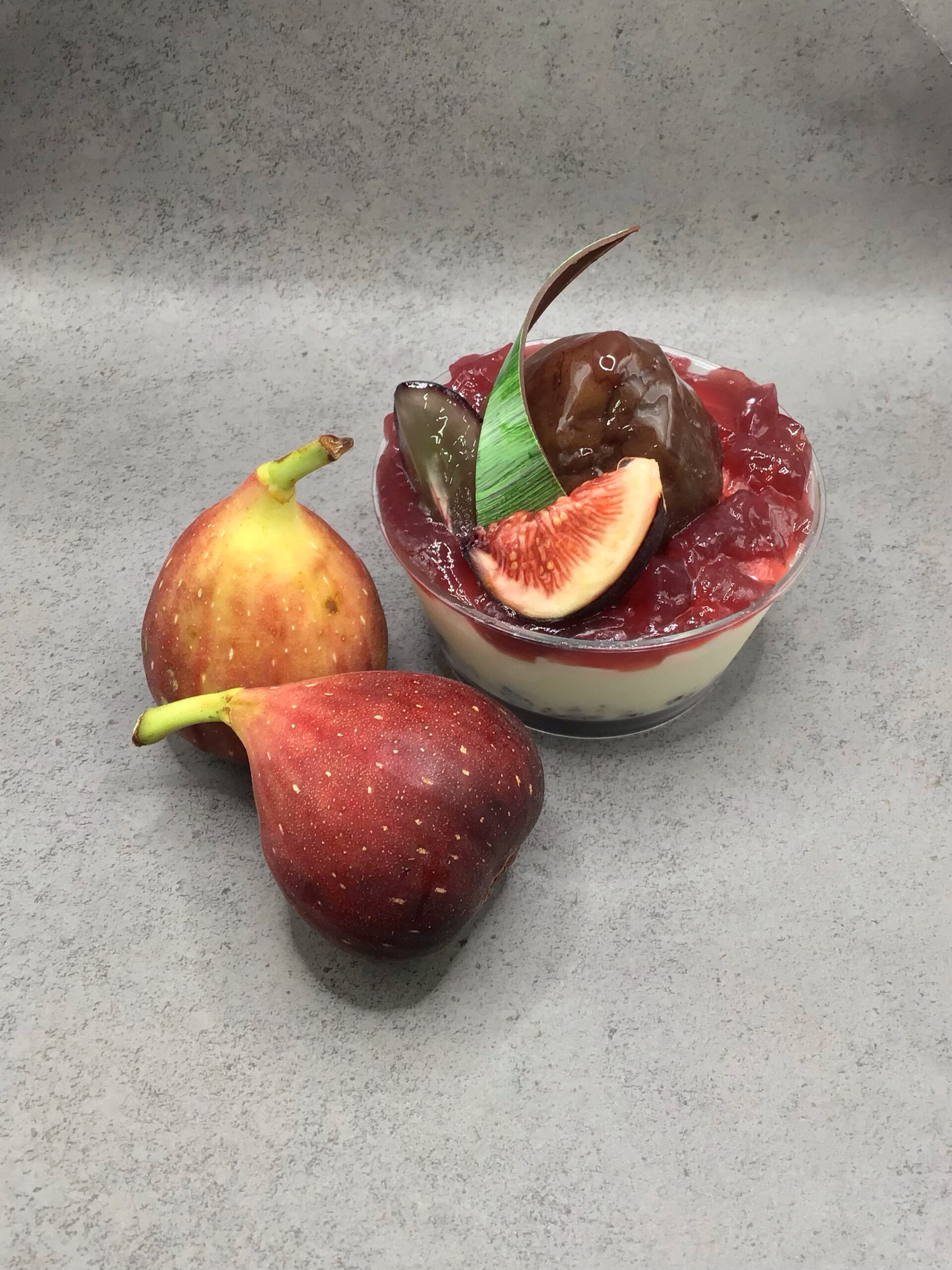 新潟県産いちじくを赤ワインでじっくりとコンポートし、バニラのムースと組み合わせた新商品です。赤ワインで作ったゼリーが鮮やかさを引き立たせます。ぜひ、お試しください。