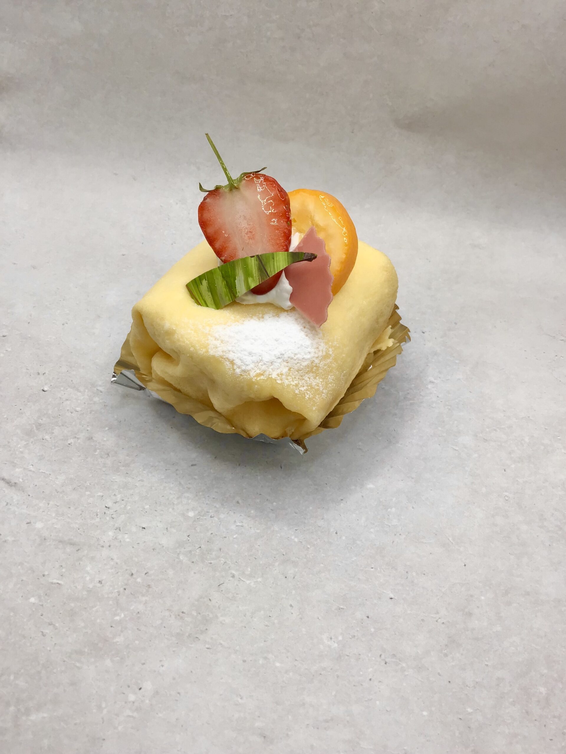 しっとりとしたクレープ生地に、生クリーム、カスタード、カシスオレンジのムースを包みました。